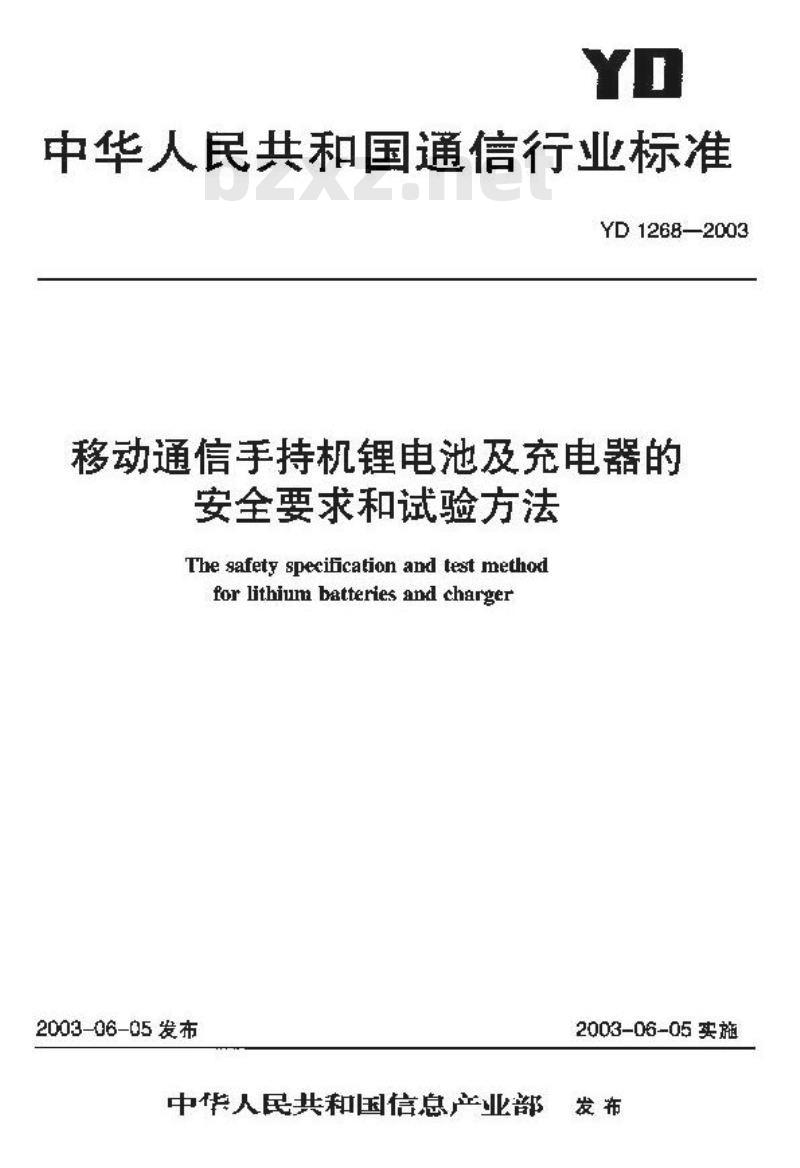 YD 1268规定了移动通信手持机锂电池的安全性能要求,包括正常使用及可能发生误操作时的安全性要求和试验方法。