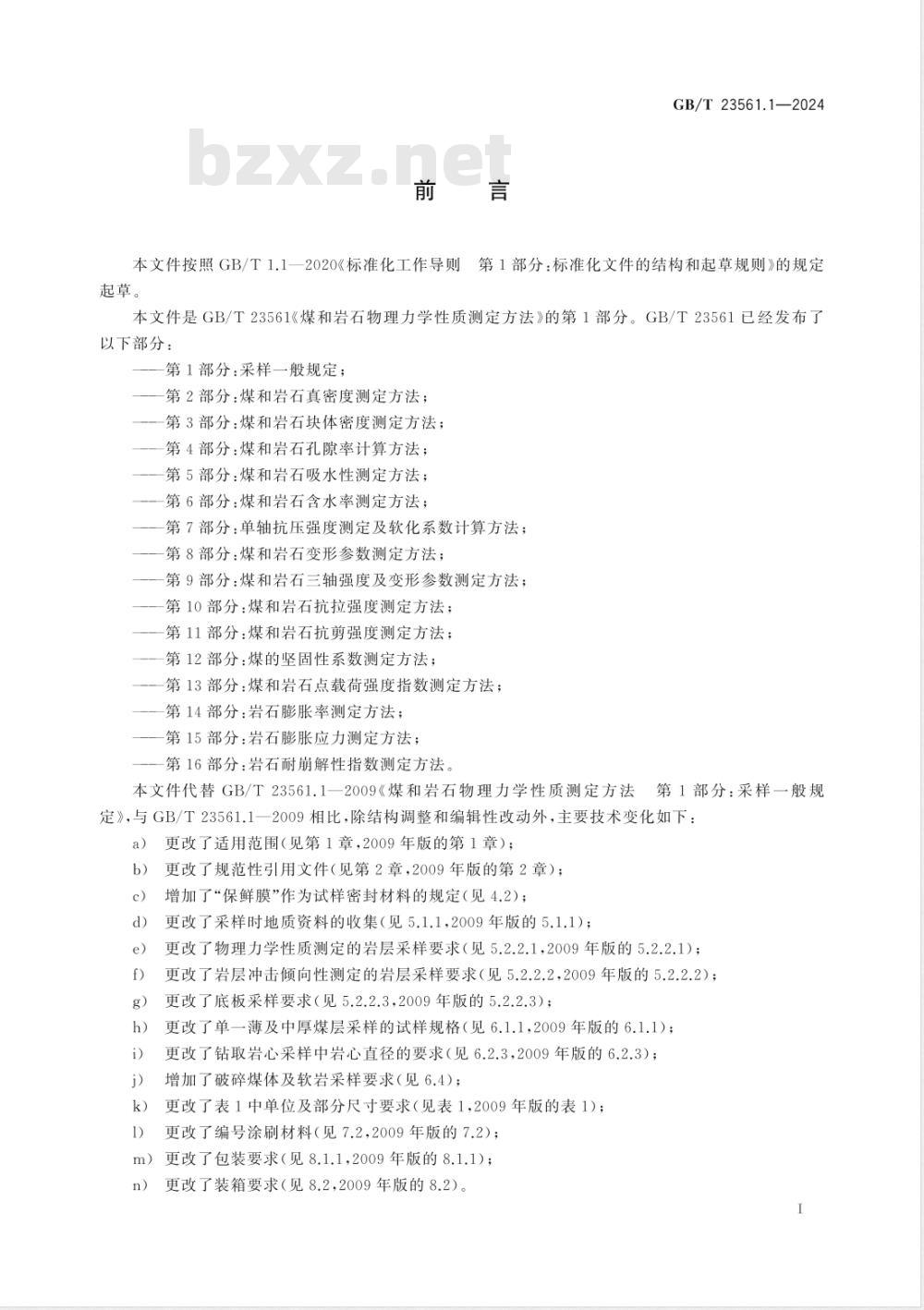第2部分:煤和岩石真密度测定方法;第3部分:煤和岩石块体密度测定方法;第4部分:煤和岩石孔隙率计算方法;一第5部分:煤和岩石吸水性测定方法;第6部分:煤和岩石含水率测定方法;第7部分:单轴抗压强度测定及软化系数计算方法;第8部分:煤和岩石变形参数测定方法;第9部分:煤和岩石三轴强度及变形参数测定方法;第10部分:煤和岩石抗拉强度测定方法;第11部分:煤和岩石抗剪强度测定方法;第12部分:煤的坚固性系数测定方法;—第13部分:煤和岩石点载荷强度指数测定方法;第14部分:岩石膨胀率测定方法;第15部分:岩石膨胀应力测定方法;第16部分:岩石耐崩解性指数测定方法。本文件代替GB/T23561.1一2009《煤和岩石物理力学性质测定方法第1部分:采样一般规定》,与GB/T23561.1一2009相比,除结构调整和编辑性改动外,主要技术变化如下:a)