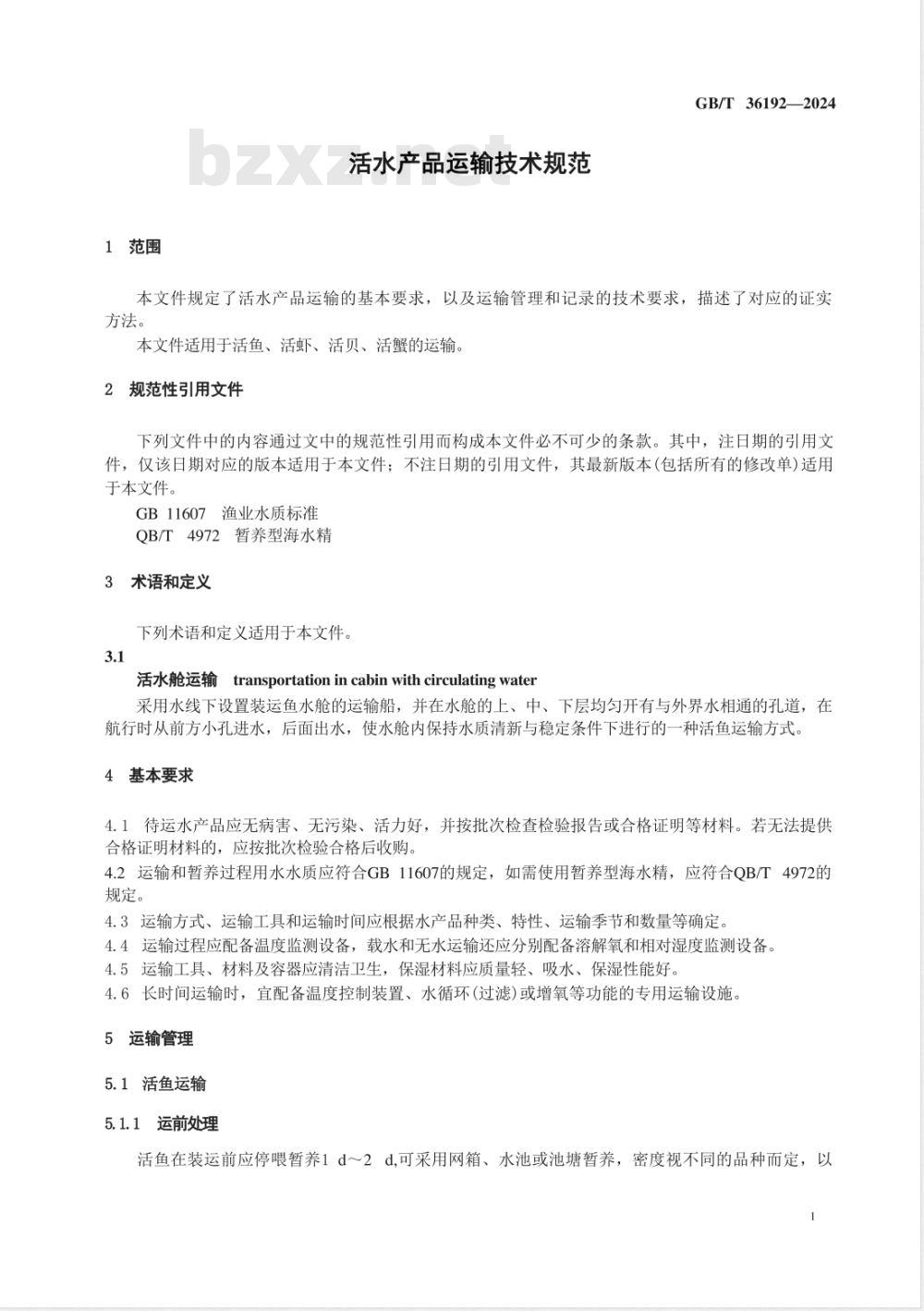 本文件代替GB/T36192—2018《活水产品运输技术规范》,与GB/T36192—2018相比,除结构调整和编辑性改动外,主要技术变化如下:删除了涉及食品安全要求的相关内容(见2018年版的3.1);更改了基本要求(见第4章,2018年版的第3章);更改了运输工具的要求(见4.3和4.5.2018年版的第4章):更改了活鱼运输(见5.1.2018年版的5.1):更改了活贝载水运输(见5.4.2,2018年版的5.4.2)1删除了暂养的技术要求(见2018年版的第6章);-增加了记录要求(见第6章)。请注意本文件的某些内容可能涉及专利。本文件的发布机构不承担识别专利的责任。本文件由中华人民共和国农业农村部提出。本文件由全国水产标准化技术委员会(SAC/TC156归口。