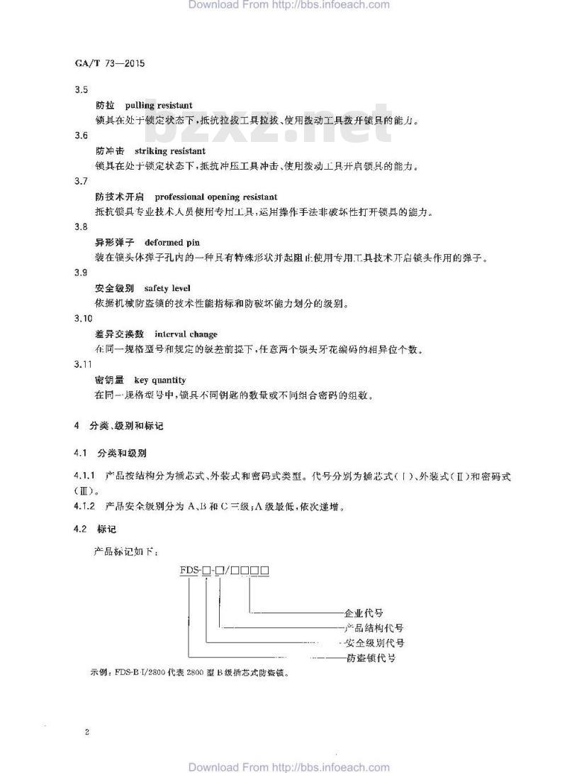 GA/T 73适用于防盗安全门上使用的插芯式、外装式和密码式机械防盗锁。防盗保险柜(箱)上使用的机械防盗锁可部分参照使用。