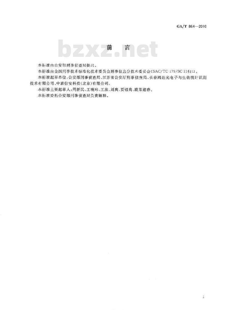 本标准由全国刑事技术标准化技术委员会刑事信息分技术委员会(SAC/TC179/SC2)归口。本标准起草单位:公安部刑事侦查局、江苏省公安厅刑事侦查局、长春鸿达光电子与生物统计识别技术有限公司、中盾信安科技(北京)有限公司。本标准主要起草人:周新民、王玮、王欣、刘爽、贾银高、欧阳迎春。本标准委托公安部刑事侦查局负责解释。1