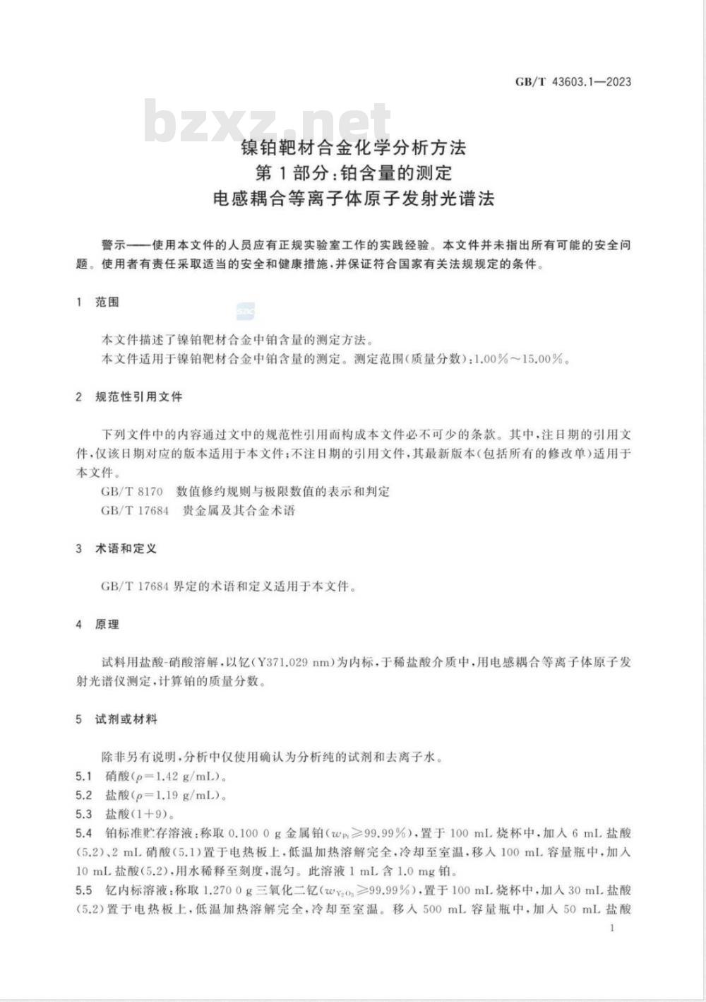 【国家标准】 镍铂靶材合金化学分析方法 第1部分:铂含量的测定 电感耦合等离子体原子发射光谱法