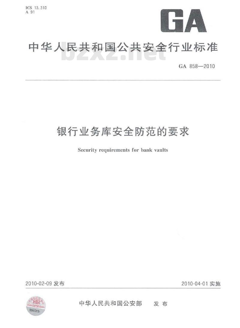 GA 858适用于银行业金融机构及从事武装守护押运服务的保安服务公司业务库。其他金融机构业务库可参照执行。