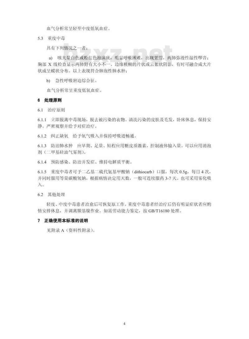 轻度、中度中毒患者治愈后可恢复原工作。重度中毒患者经治疗后仍有明显症状者应酌情安排休息,并调离羰基镍作业。如需劳动能力鉴定,按GB/T16180处理。7正确使用本标准的说明
