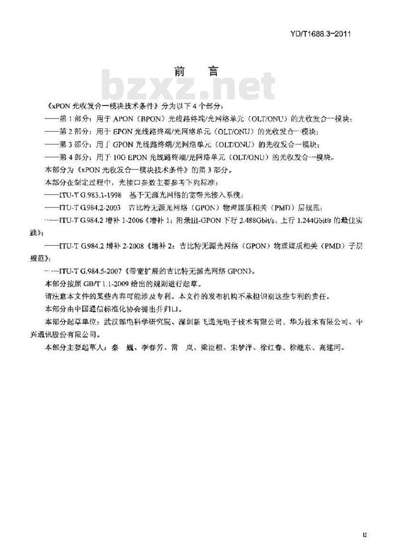 --ITU-TG.984.5-2007带宽扩展的吉比特无源光网络GPON》。本部分按照GB/T 1.1-20H给出的规则进行起草。请注意本文件的某些内穿可能涉及专利。本文件的发布机构不承担识别这些专利的责任。本部分由中国通信标准化协会提出并归口。本部分起草单位:武汉邮他科学研究院、深圳新飞通光电子技术有限公司、华为技术有限公司、中兴通讯股份有限公司。