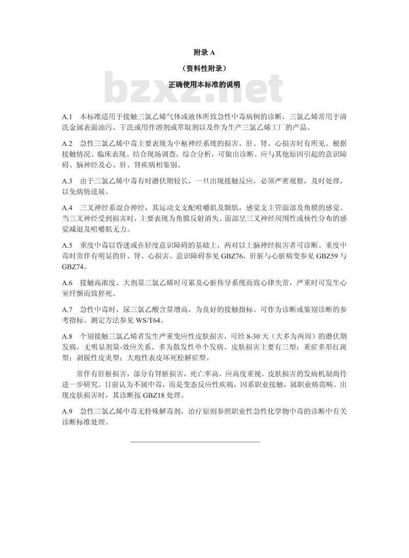 A.1本标准适用于接触三氯乙烯气体或液体所致急性中毒病例的诊断,三氯乙烯常用于清洗金属表面油污、干洗或用作溶剂或萃取剂以及作为生产三氯乙烯工厂的产品A.2急性三氯乙烯中毒主要表现为中枢神经系统的损害。肝、肾、心损害时有所见。根据接触情况、临床表现、结合现场调查,综合分析,可做出诊断。应与其他原因引起的意识障碍、脑神经及心、肝、肾疾病相鉴别A.3由于三氯乙烯中毒有时潜伏期较长,一旦出现接触反应,必须严密观察,及时处理,以免病情进展。