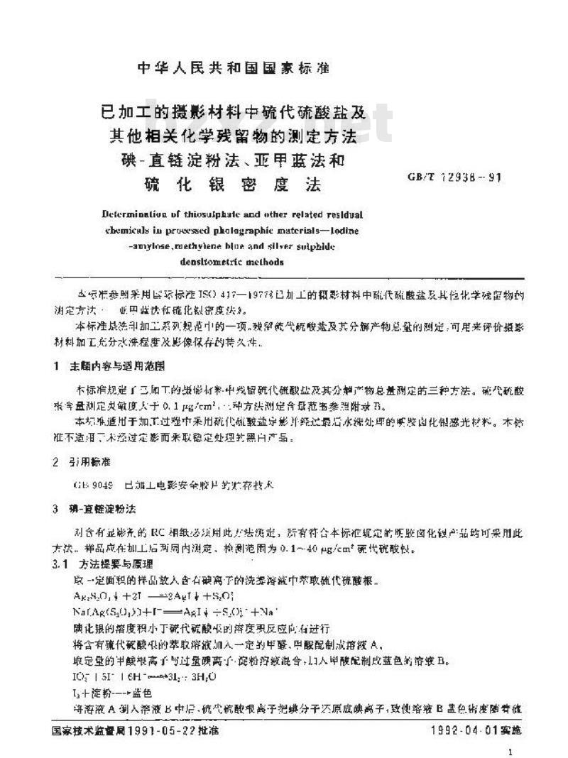【GB国家标准】 已加工的摄影材料中硫代硫酸盐及其他相关化学残留物的测定方法碘-直链淀粉法、亚甲蓝法和硫化银密度法