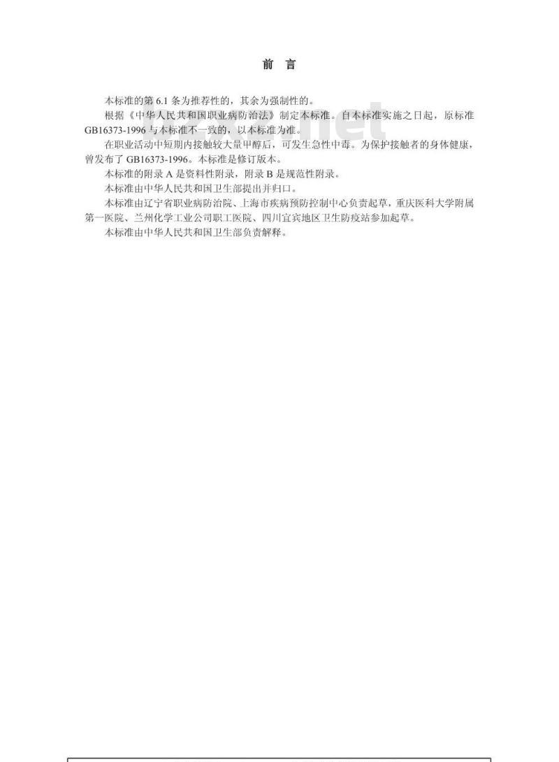 本标准的第6.1条为推荐性的,其余为强制性的。根据《中华人民共和国职业病防治法》制定本标准。自本标准实施之日起,原标准GB16373-1996与本标准不一致的,以本标准为准。在职业活动中短期内接触较大量甲醇后,可发生急性中毒。为保护接触者的身体健康,曾发布了GB16373-1996。本标准是修订版本。本标准的附录A是资料性附录,附录B是规范性附录。本标准由中华人民共和国卫生部提出并归口。本标准由辽宁省职业病防治院、上海市疾病预防控制中心负责起草,重庆医科大学附属第一医院、兰州化学工业公司职工医院、四川宜宾地区卫生防疫站参加起草。本标准由中华人民共和国卫生部负责解释。..com职业性急性甲醇中毒诊断标准