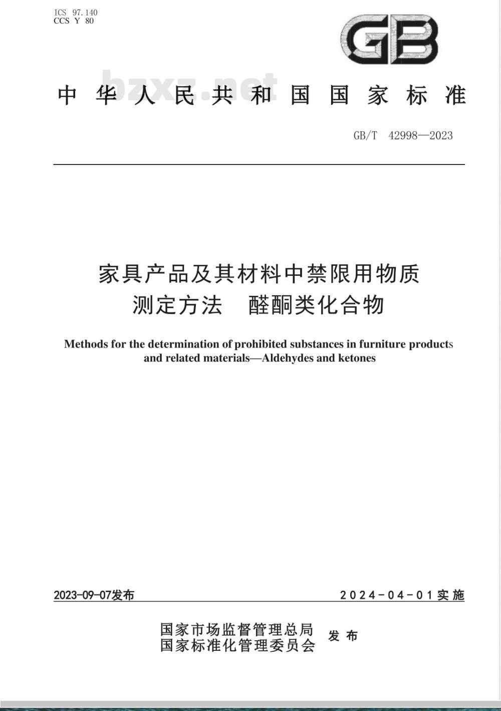 - GB/T 42998-2023家具产品及其材料中禁限用物质测定方法 醛酮类化合物