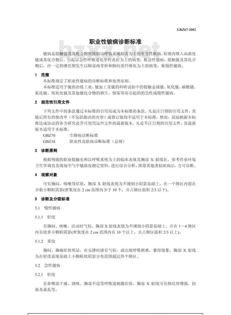 本标准规定了职业性铍病的诊断标准和处理原则。本标准适用于铍的冶炼工业、铍加工及铍的科研试验中的接触金属铍、氧化铍、碳酸铍、氟化铍、氢氧化铍及其他铍化合物的烟尘、烟雾等而引起的的急性或慢性铍病。 GBZ 67-2002 职业性铍病诊断标准 GBZ67-2002