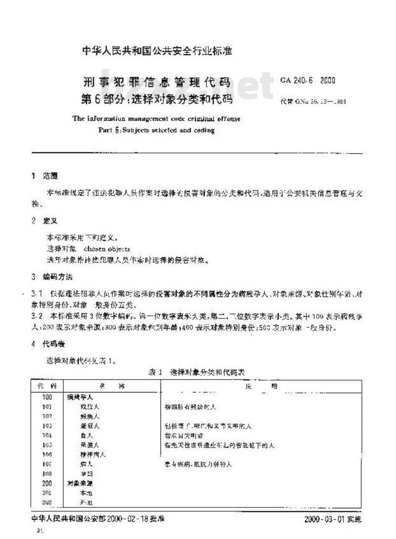 - GA 240.6-2000 刑事犯罪信息管理代码第6部分:选择对象分类和代码