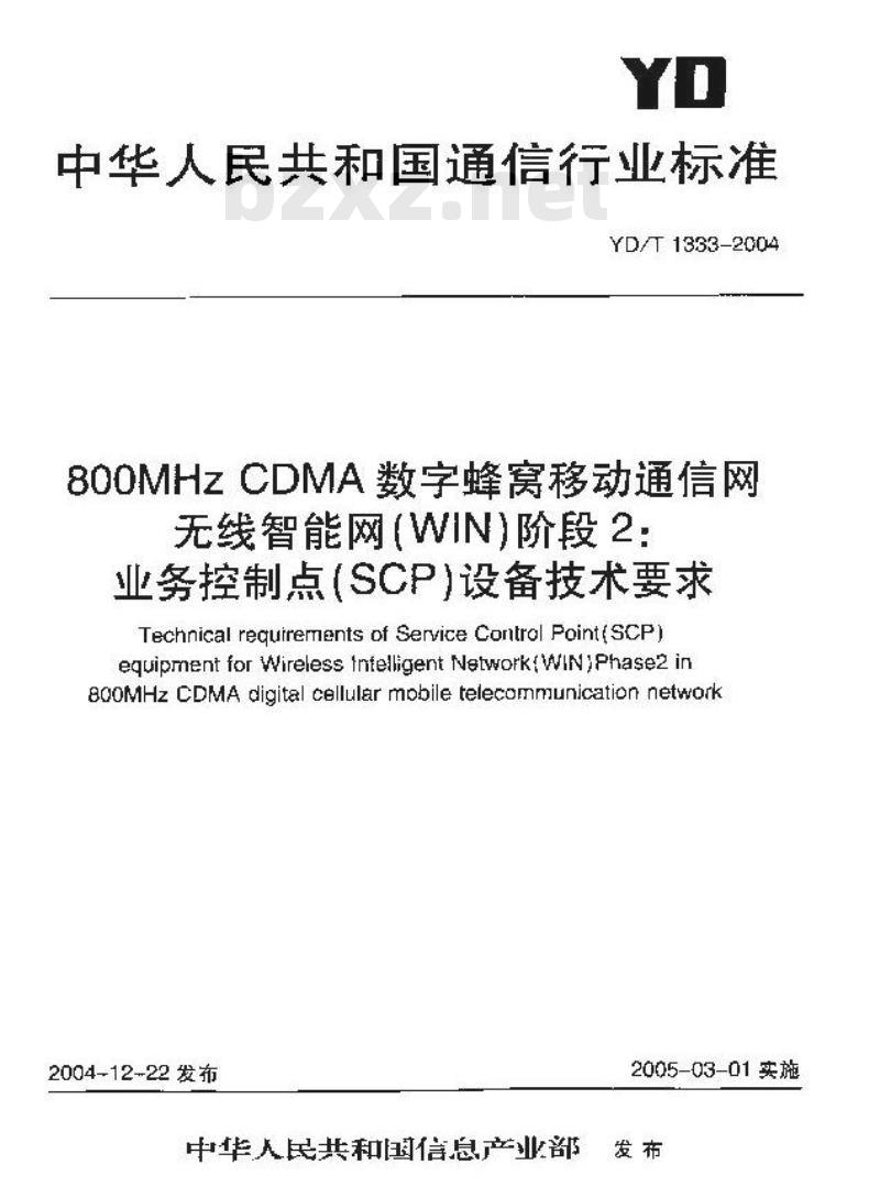 YD/T 1333适用于800MHz CDMA数字蜂窝移动通信网无线智能网WIN第二二阶段的业务控制点(SCP)设备。