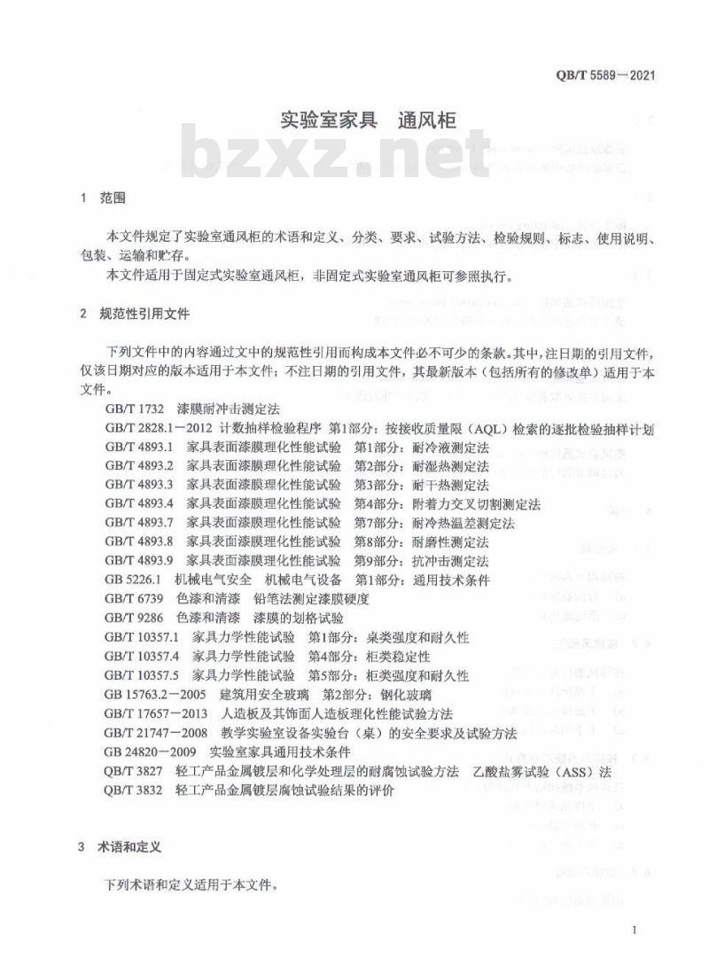 QB/T 5589规定了实验室通风柜的术语和定义、分类、要求、试验方法、检验规则、标志、使用说明、包装、运输和贮存。