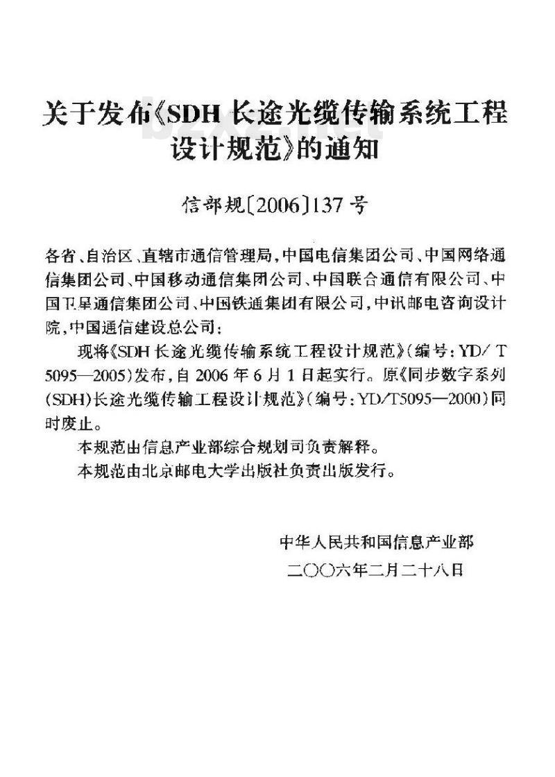 1.0.1YD/T 5095适用于新建SDH长途光缆传输工程设计。对于改、扩建SDH光缆传输工程设计,可参照本规范执行。