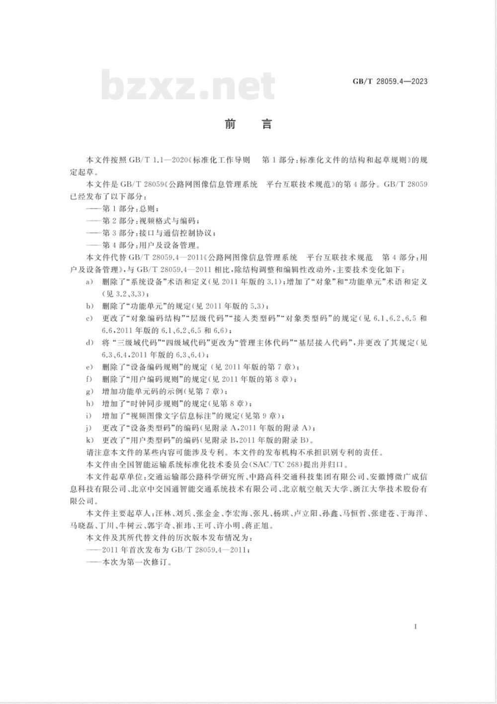 第1部分:标准化文件的结构和起草规则》的规平台互联技术规范》的第4部分。GB/T28059本文件代替GB/T28059.4一2011《公路网图像信息管理系统平台互联技术规范第4部分:用户及设备管理》,与GB/T28059.4一2011相比,除结构调整和编辑性改动外,主要技术变化如下:a
