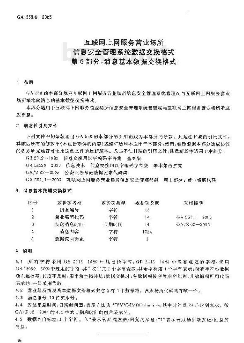 GA 558.6规定互联网上网服务营业场所信息安全管理系统管理端与互联网上网服务营业场所端之间消息的基本数据交换格式。