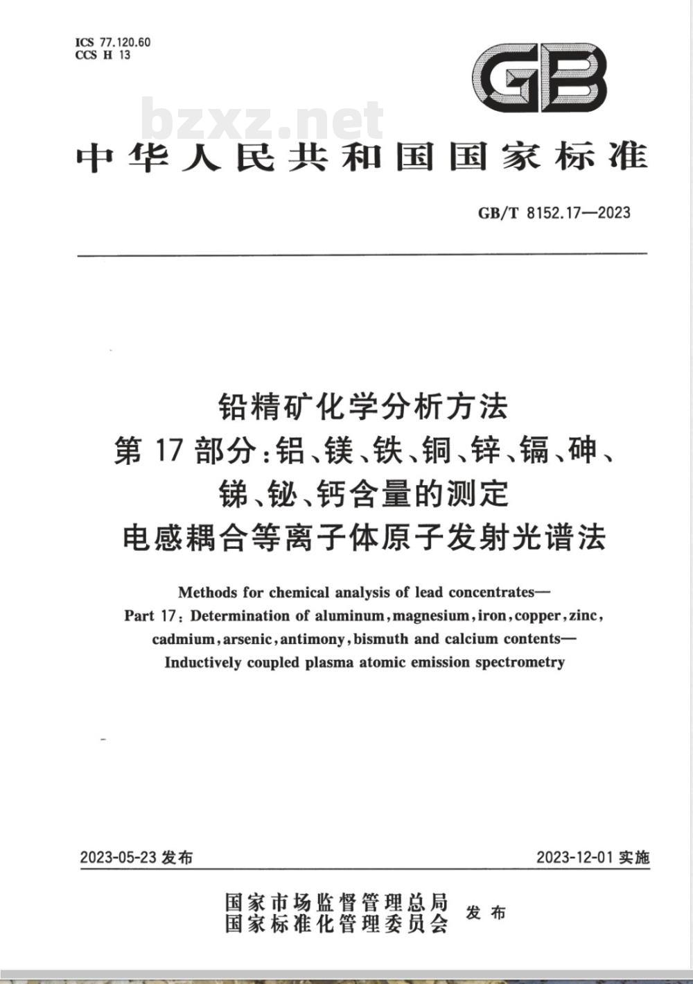 【国家标准】 铅精矿化学分析方法 第17部分:铝、镁、铁、铜、锌、镉、砷、锑、铋、钙含量的测定 电感耦合等离子体原子发射光谱法