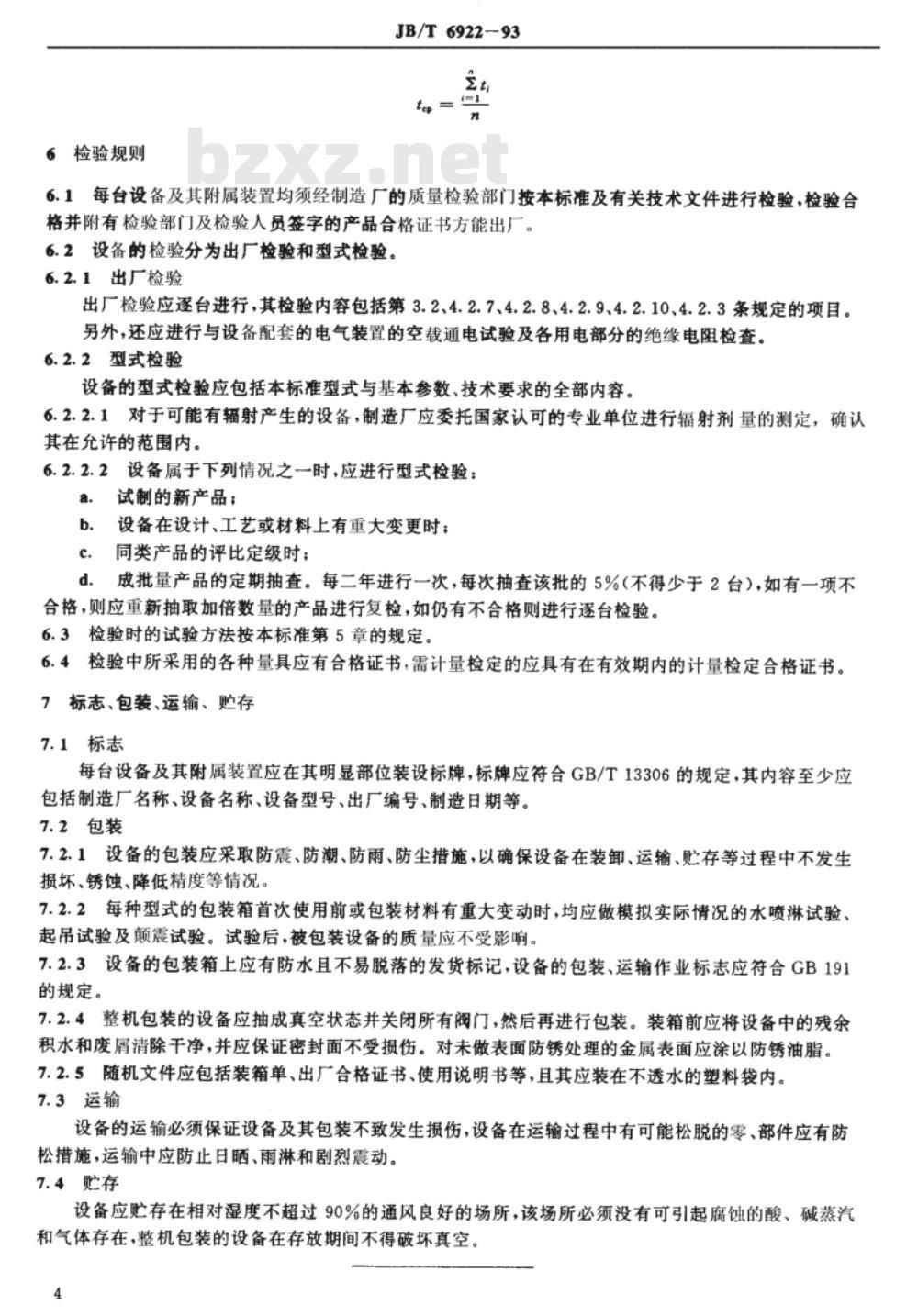d.成批量产品的定期抽查。每二年进行一次,每次抽查该批的5%(不得少于2台),如有一项不合格,则应重新抽取加倍数量的产品进行复检,如仍有不合格则进行逐台检验。6.3检验时的试验方法按本标准第5章的规定。6.4检验中所采用的各种量具应有合格证书,需计量检定的应具有在有效期内的计量检定合格证书。7标志、包装、运输、贮存
