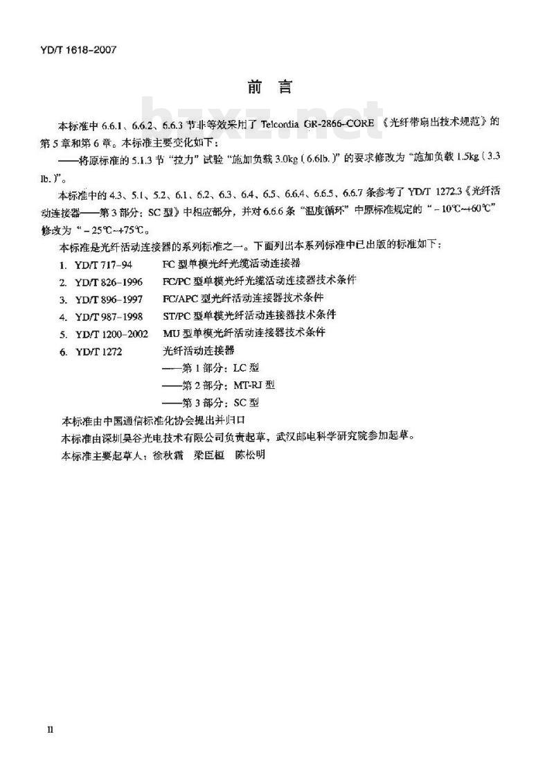 本标准中的4.3、5.1、5.2、6.1、6.2、6.3、6.4、6.5、6.6.4、6.6.5、6.6.7条参考了YDT1272.3《光纤活动连接器——第3部分:SC型》中相应部分,并对6.6.6条“温度循环”中原标准规定的“=10℃~+60℃”修改为 -25%~+75℃。