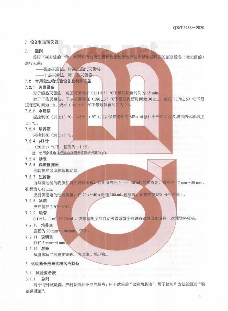对基于试验样品的洗液进行验证,该洗液的结果应是无菌的,且在试验所描述的条件下,与所用滤膜相符并具有透过滤膜的过滤能力。7设备和玻璃仪器