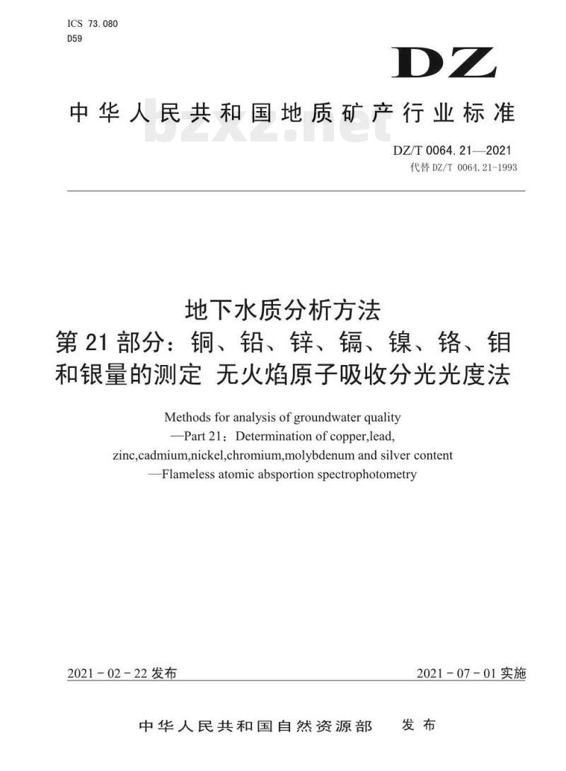 DZ/T 0064的DZ/T 0064.21规定了无火焰原子吸收分光光度法测定地下水中铜、铅、锌、镉、镍、铬、钼和银的方法。