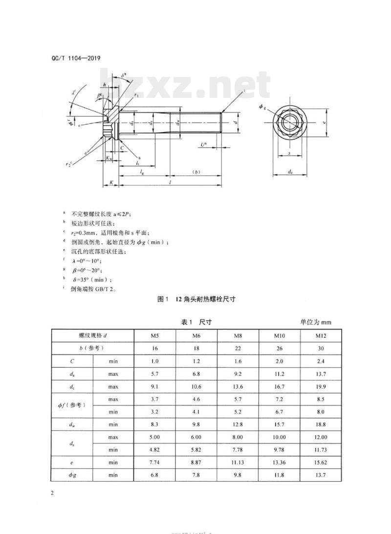 1.1本标准规定了汽车用12角头耐热螺栓的型式尺寸、技术条件和编号。QC/T1104—2019