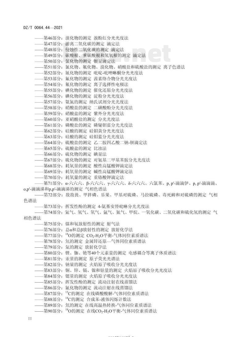 第75部分:镭和氢放射性的测定射气法第76部分:总α和总β放射性的测定放射化学法第77部分:18O的测定CO2-H2O平衡-气体同位素质谱法第78部分:氛的测定金属锌还原一气体同位素质谱法第79部分:氙的测定放射化学法第80部分:锂、、等40个元素量的测定电感耦合等离子体质谱法第81部分:汞量的测定原子荧光光谱法第82部分:钠量的测定火焰原子吸收分光光度法第83部分:铜、锌、镉、镍和钻量的测定火焰原子吸收分光光度法第84部分:锶量的测定火焰原子吸收分光光度法第85部分:挥发性酚的测定流动注射在线蒸馏法第86部分:氰化物的测定流动注射在线蒸馏法第87部分:13C的测定在线磷酸酸解-气体同位素质谱法第88部分:14c的测定合成苯-液体闪烁计数法第89部分:氛的测定在线高温热转换-气体同位素质谱法第90部分:180的测定在线CO2-H20平衡-气体同位素质谱法I
