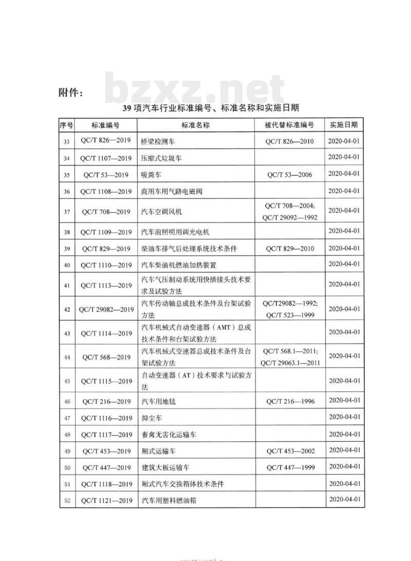 出版社出版,通信行业标准(工程建设类)由北京邮电大学出版社出版。以上石化、纺织行业计量技术规范由中国质检出版社出版,建材行业计量技术规范由中国建材工业出版社出版,机械行业计量技术规范由机械工业出版社出版,轻工行业计量技术规范由中国轻工业出版社出版,电子行业计量技术规范由中国电子技术标准化研究院组织出版,通信行业计量技术规范由中国信息通信研究院组织出版。附件:39项汽车行业标准编号、标准名称和实施日期中华人民共和国工业和信息化部二〇一九年十一月十一日