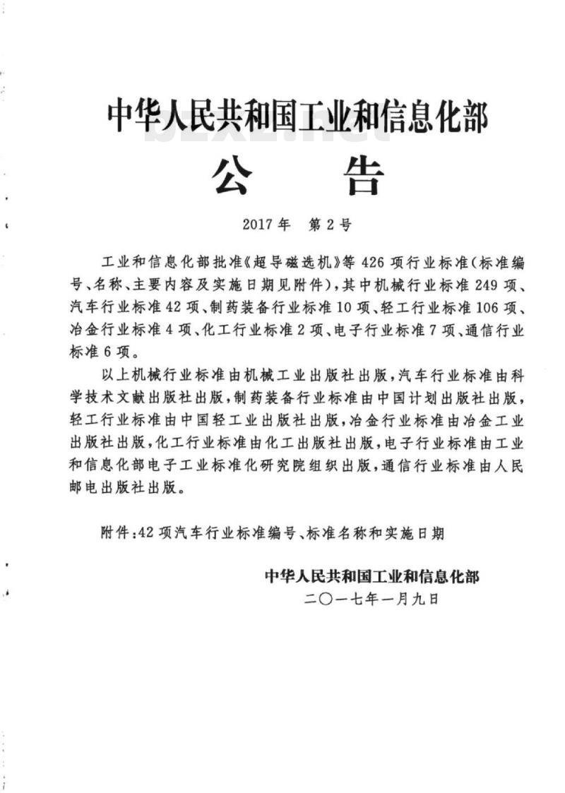 附件:42项汽车行业标准编号、标准名称和实施日期中华人民共和国工业和信息化部二〇一七年一月九日