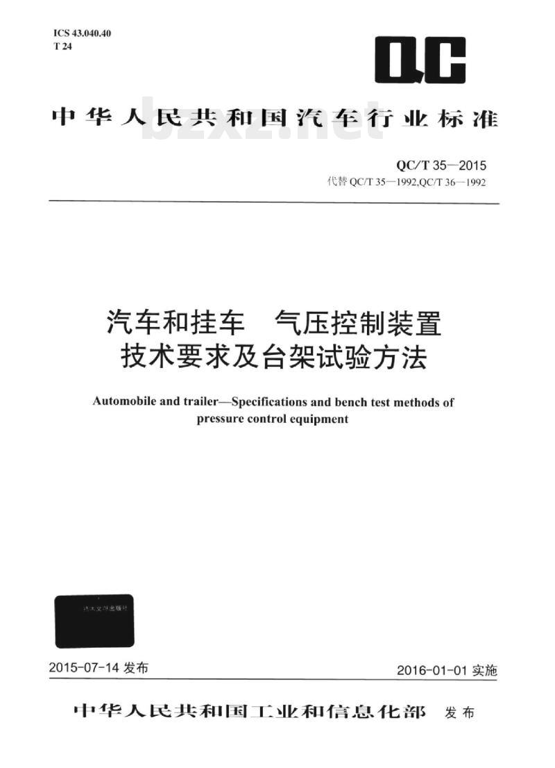 - QC/T 35-2015 汽车和挂车气压控制装置技术要求及台架试验方法