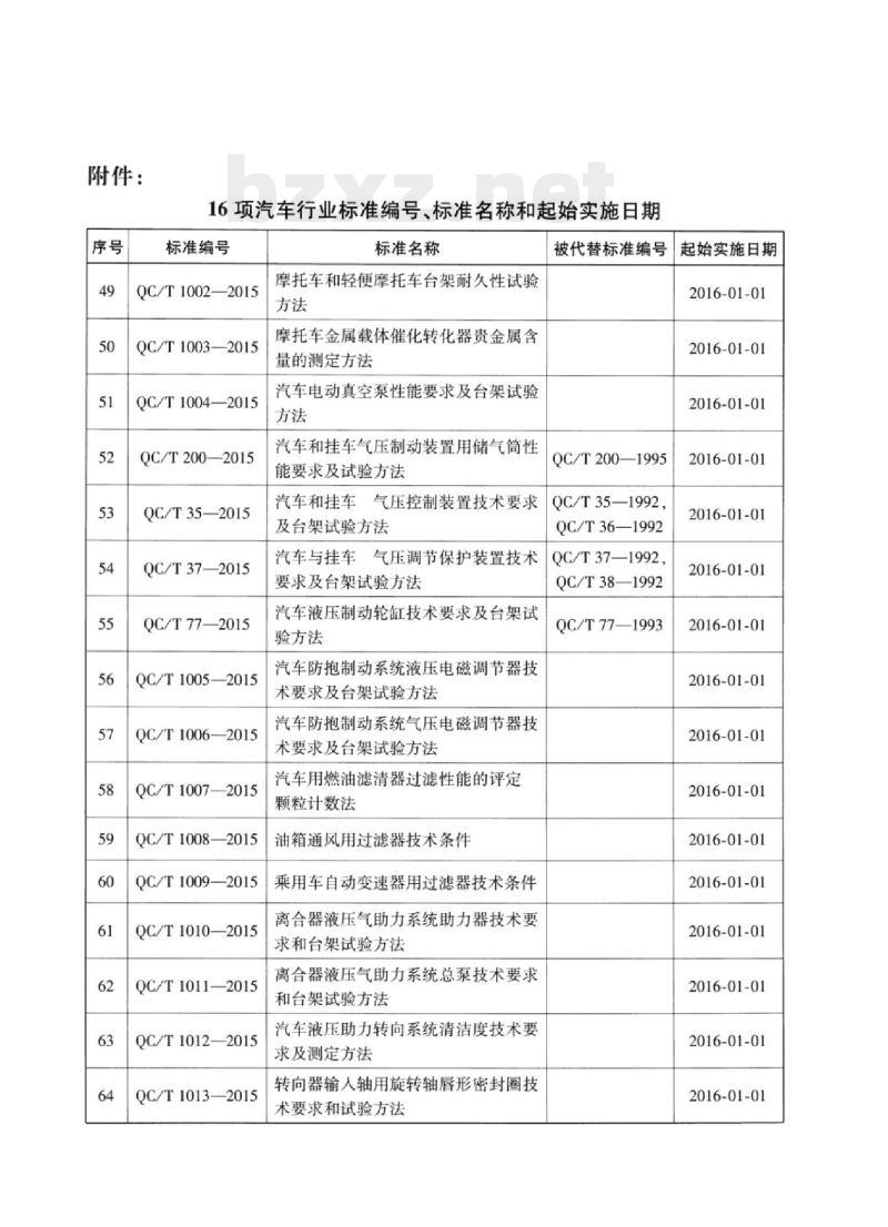 附件:16项汽车行业标准编号、标准名称和起始实施日期中华人民共和国工业和信息化部二〇一五年七月十四日