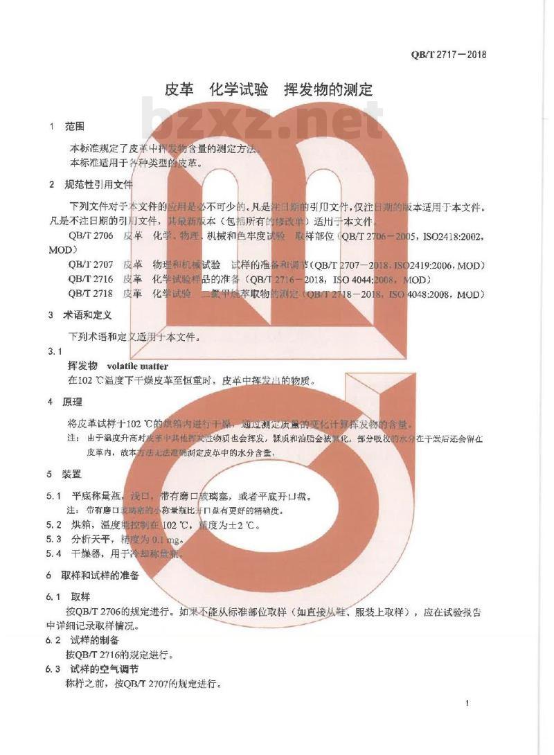 QB/T 2717一2018.Leather一Chemical tests- Determination of volatile matter.