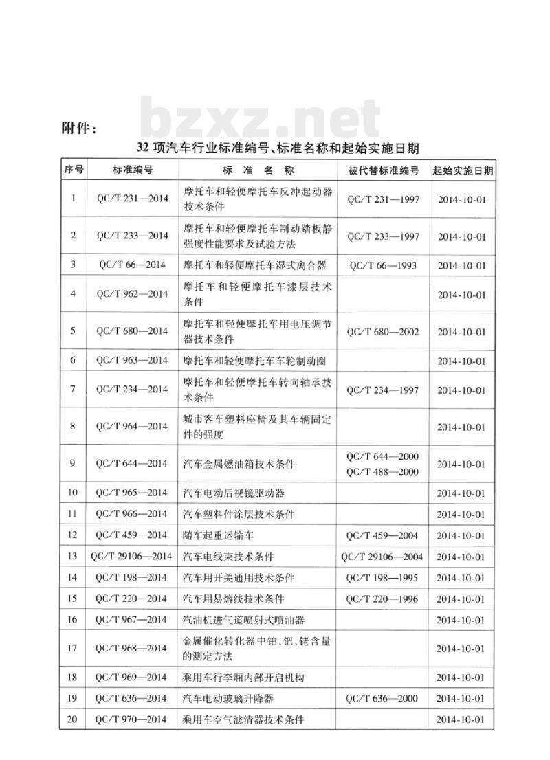 以上机械行业标准由机械工业出版社出版,汽车行业标准及化工、有色金属工程建设行业标准由中国计划出版社出版,船舶行业标准由中国船舶工业综合技术经济研究院组织出版,航空行业标准由中国航空综合技术研究所组织出版,化工行业标准由化工出版社出版,冶金行业标准由冶金工业出版社出版,建材行业标准由建材工业出版社出版,石化行业标准由中国石化出版社出版,轻工行业标准由中国轻工业出版社出版,纺织行业标准由中国标准出版社出版,兵工民品行业标准由中国兵器工业标准化研究所组织出版,核行业标准由核工业标准化研究所组织出版,电子行业标准由工业和信息化部电子工业标准化研究院组织出版,通信行业标准由人民邮电出版社出版、通信工程建设行业标准由北京邮电大学出版社出版。附件:32项汽车行业标准编号、标准名称和起始实施日期。中华人民共和国工业和信息化部二〇一四年五月六日