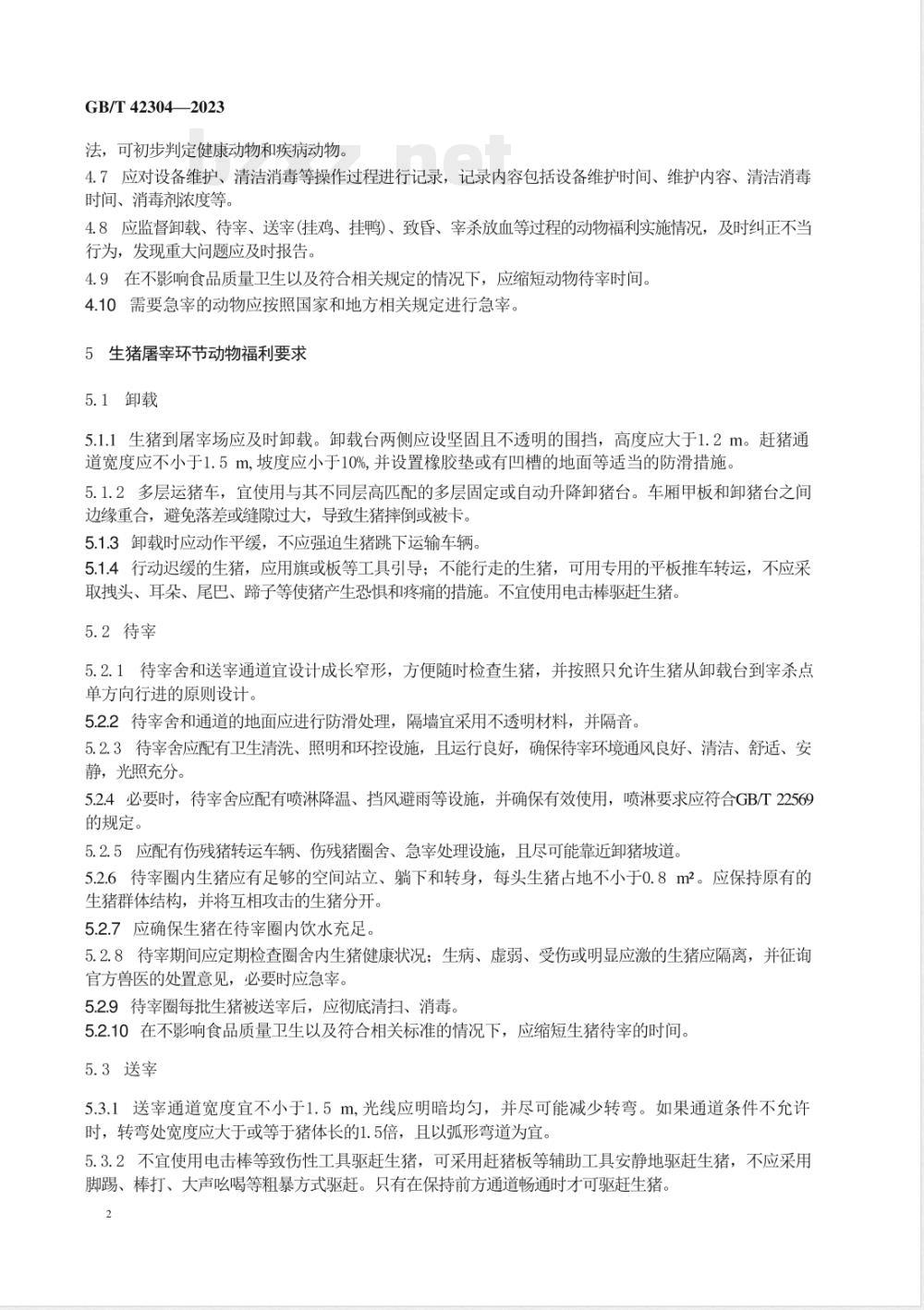 4.8应监督卸载、待宰、送宰(挂鸡、挂鸭)、致昏、宰杀放血等过程的动物福利实施情况,及时纠正不当行为,发现重大问题应及时报告。4.9在不影响食品质量卫生以及符合相关规定的情况下,应缩短动物待宰时间。4.10需要急的动物应按照国家和地方相关规定进行急宰。5生猪屠宰环节动物福利要求