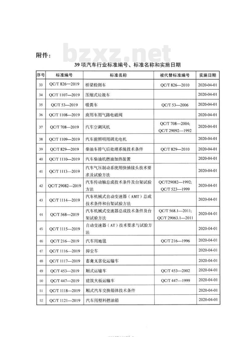 出版社出版,通信行业标准(工程建设类)由北京邮电大学出版社出版。以上石化、纺织行业计量技术规范由中国质检出版社出版,建材行业计量技术规范由中国建材工业出版社出版,机械行业计量技术规范由机械工业出版社出版,轻工行业计量技术规范由中国轻工业出版社出版,电子行业计量技术规范由中国电子技术标准化研究院组织出版,通信行业计量技术规范由中国信息通信研究院组织出版。附件:39项汽车行业标准编号、标准名称和实施日期中华人民共和国工业和信息化部二〇一九年十一月十一日