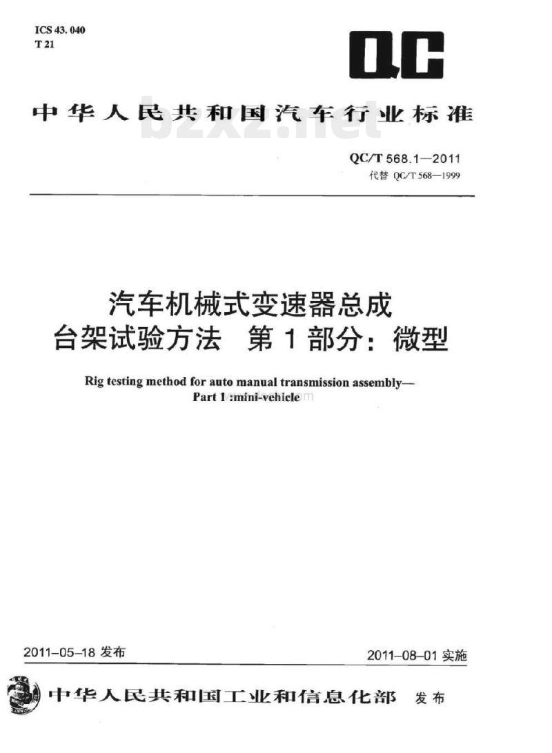 - QC/T 568.1-2011 汽车机械式变速器总成台架试验方法第1部分:微型