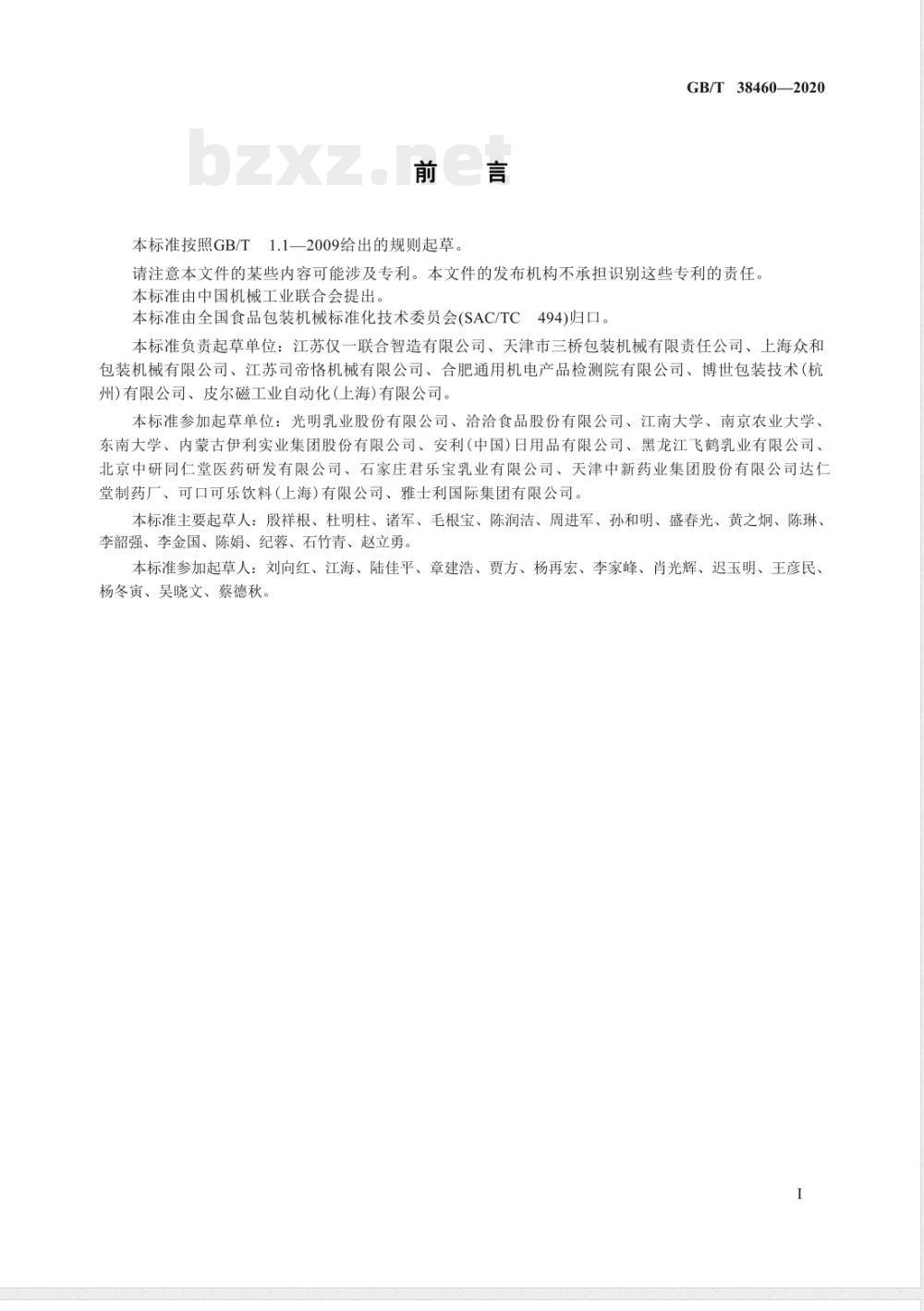 请注意本文件的某些内容可能涉及专利。本文件的发布机构不承担识别这些专利的责任。本标准由中国机械工业联合会提出。本标准由全国食品包装机械标准化技术委员会(SAC/TC494)归口。本标准负责起草单位:江苏仅一联合智造有限公司、天津市三桥包装机械有限责任公司、上海众和包装机械有限公司、江苏司帝恪机械有限公司、合肥通用机电产品检测院有限公司、博世包装技术(杭州)有限公司、皮尔磁工业自动化(上海)有限公司。本标准参加起草单位:光明乳业股份有限公司、洽洽食品股份有限公司、江南大学、南京农业大学、东南大学、内蒙古伊利实业集团股份有限公司、安利(中国)日用品有限公司、黑龙江飞鹤乳业有限公司、北京中研同仁堂医药研发有限公司、石家庄君乐宝乳业有限公司、天津中新药业集团股份有限公司达仁堂制药厂、可口可乐饮料(上海)有限公司、雅士利国际集团有限公司。本标准主要起草人:殷祥根、杜明柱、诸军、毛根宝、陈润洁、周进军、孙和明、盛春光、黄之炯、陈琳、李韶强、李金国、陈娟、纪蓉、石竹青、赵立勇。本标准参加起草人:刘向红、江海、陆佳平、章建浩、贾方、杨再宏、李家峰、肖光辉、迟玉明、王彦民杨冬寅、吴晓文、蔡德秋。