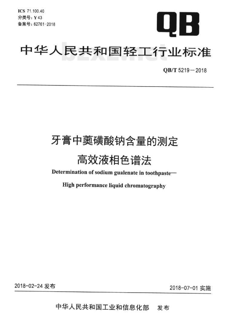 QB/T 5219-2018.Determination of sodium gualenate in toothpaste-High performance liquid chromatography.
