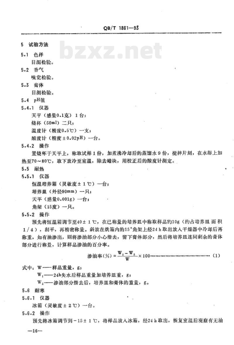 置烧杯于天平上,称取试样1份,加煮沸冷却后的蒸馏水9份,搅拌片刻,在水浴上加热至70~80℃,取下放冷至室温,除去蜡块,用校正后的酸度计测定。5.5耐热