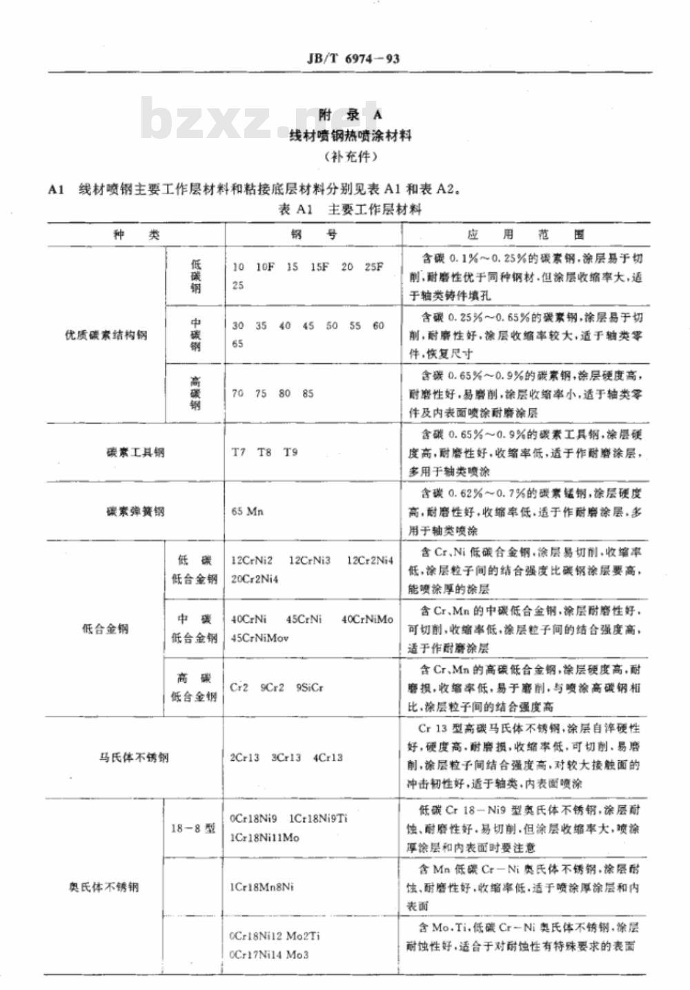 工作层材料的选择应满足工件的使用要求及热喷涂的工艺性·或由供需双方商定。主要喷涂材料种类、钢号及应用范围见附录A(补充件)中表A1。3.2粘结底层材料