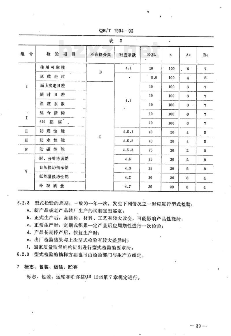 5.3.5.1防震性能试验按QB/T1%98第5章规定进行。5.3.5.2防水性能试验按QB/T1597第5章规定进行。5.3.5.3防磁性能试验按QB/T199第5章规定进行。5.3.6时、分针协调差试验
