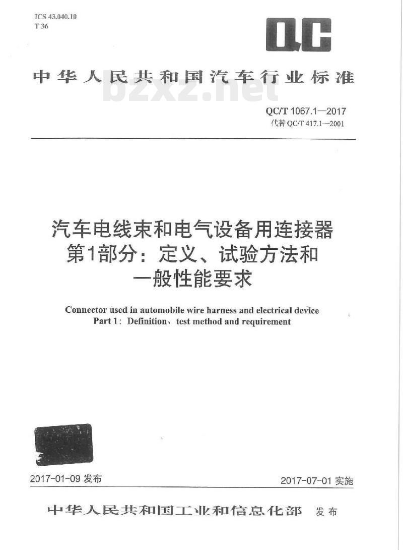 汽车电线束和电气设备用连接器第1部分:定义、试验方法和一般性能要求本标准规定了汽车连接器的定义、一般性能要求以及具体试验方法QC/T1067.1—2017