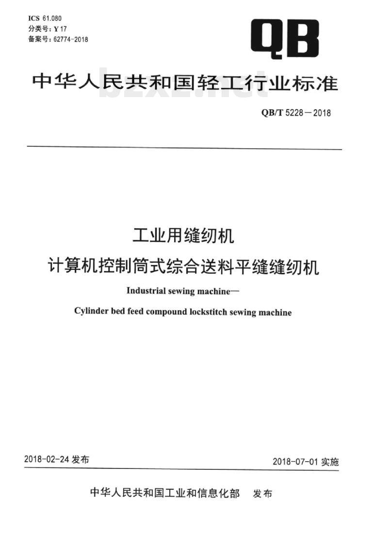 - QB/T 5228-2018 工业用缝纫机计算机控制筒式综合送料平缝缝纫机