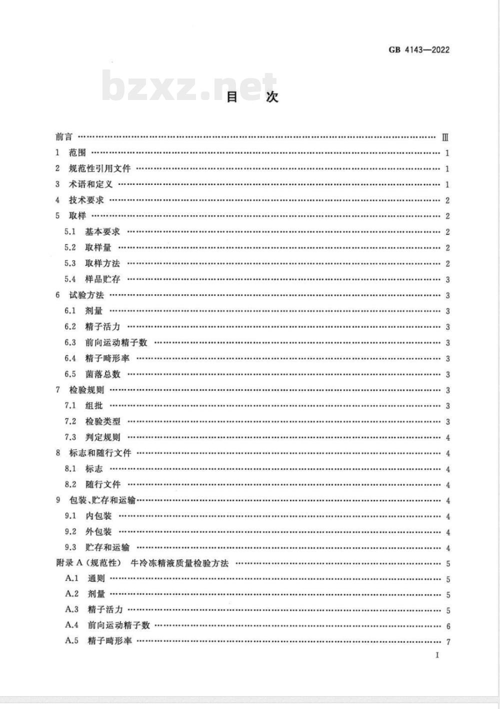 更改了“菌落总数”的定义(见3.3,2008年版的3.4);删除了“种公牛”和“新鲜精液”的要求(见2008年版的4.1、4.2);将\冻精外观”的技术要求调整为“包装要求(见9.1,2008年版的4.3);更改了“剂量”“精子活力”“前向运动精子数”“精子畸形率”和“菌落总数”的技术要求(见第4章,2008年版的4.4、4.5.1、4.5.2、4.5.3、4.5.4);删除了“抽样”(见2008年版的第5章、附录A和B.1),增加了“取样”内容(见第5章);更改了“检验类型”判定规则”(见7.2、7.3,2008年版的6.4、第7章);增加了“型式检验情况的描述(见7.2.2);-增加了“随行文件”(见8.2);增加了“贮存”“运输”(见9.3)。请注意本文件的某些内容可能涉及专利。本文件的发布机构不承担识别专利的责任。本文件由中华人民共和国农业农村部提出并归口。本文件及其所代替文件的历次版本发布情况为:-1984年首次发布为GB4143—1984,2008年第—次修订;一本次为第二次修订。