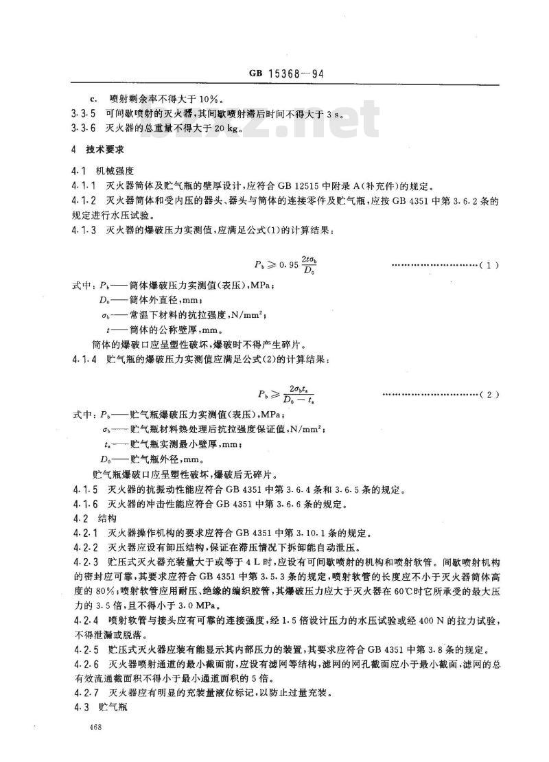4.1.1灭火器筒体及贮气瓶的壁厚设计,应符合GB12515中附录A(补充件)的规定。4.1.2灭火器筒体和受内压的器头、器头与筒体的连接零件及贮气瓶,应按GB4351中第3.6.2条的规定进行水压试验。