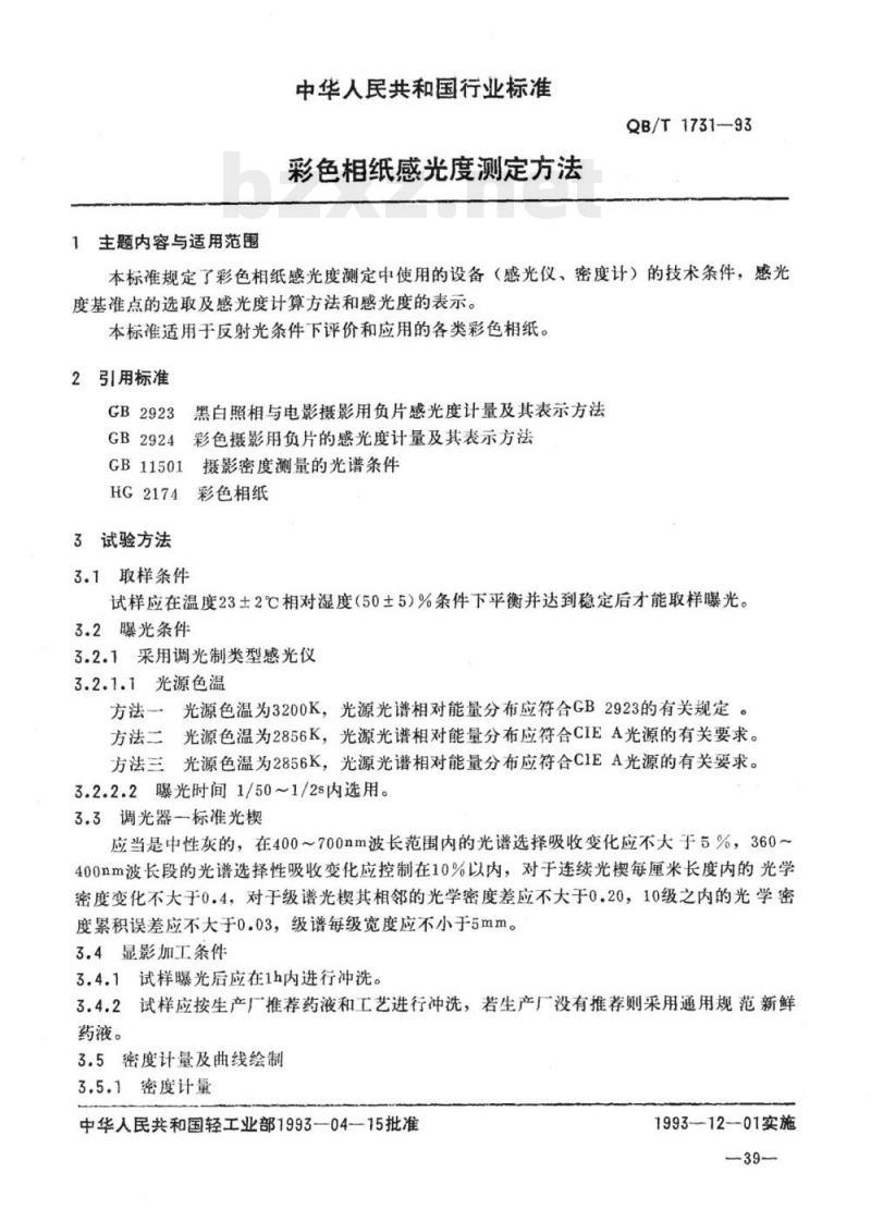 - QB/T 1731-1993 彩色相纸感光度测定方法