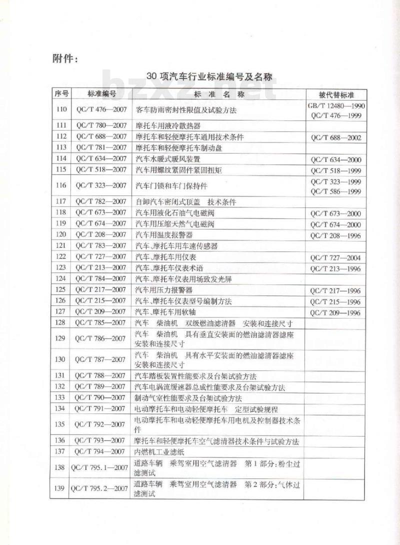 国家发展改革委批准《涤纶长丝绣花线》等139项行业标准(标准编号、名称及起始实施日期见附件一),其中纺织行业标准12项石油化工行业标准15项、有色金属行业标准70项、制药装备行业标准12项、汽车行业标准30项:批准YS/T318-2007《铜精矿》1项有色金属行业标准修改单(见附件二),现予公布,标准修改单自公布之日起实施。以上行业标准自2008年5月1日起实施。以上纺织行业标准由纺织工业出版社出版,石油化工行业标准由中国石化出版社出版,有色金属行业标准由中国标准出版社出版,制药装备行业标准和汽车行业标准由中国计划出版社出版。附件:30项汽车行业标准编号及名称中华人民共和国国家发展和改革委员会二〇七年十三月十四日