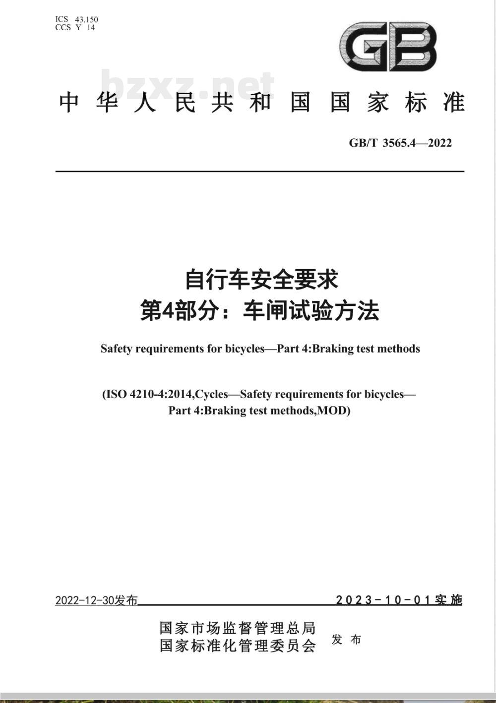 - GB/T 3565.4-2022自行车安全要求 第4部分:车闸试验方法