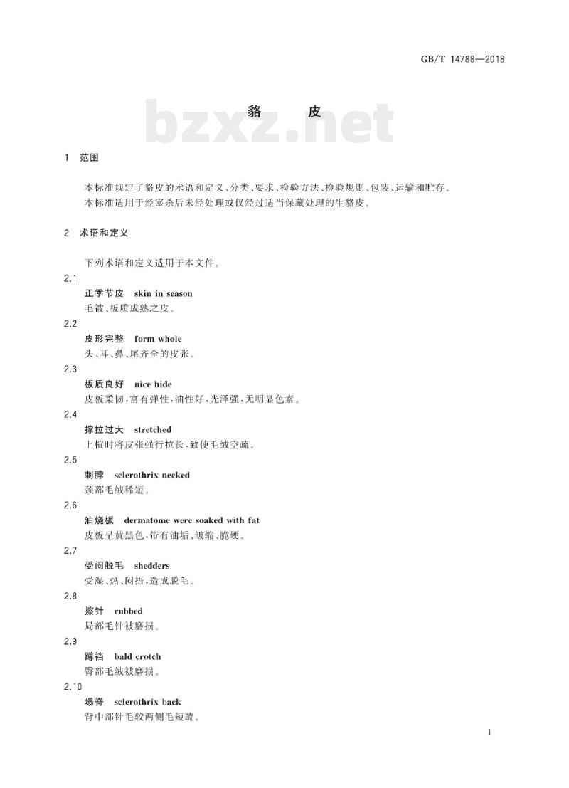 GB/T 14788规定了貉皮的术语和定义、分类、要求,检验方法,检验规则、包装、运输和贮存。本标准适用于经宰杀后未经处理或仅经过适当保藏处理的生貉皮。