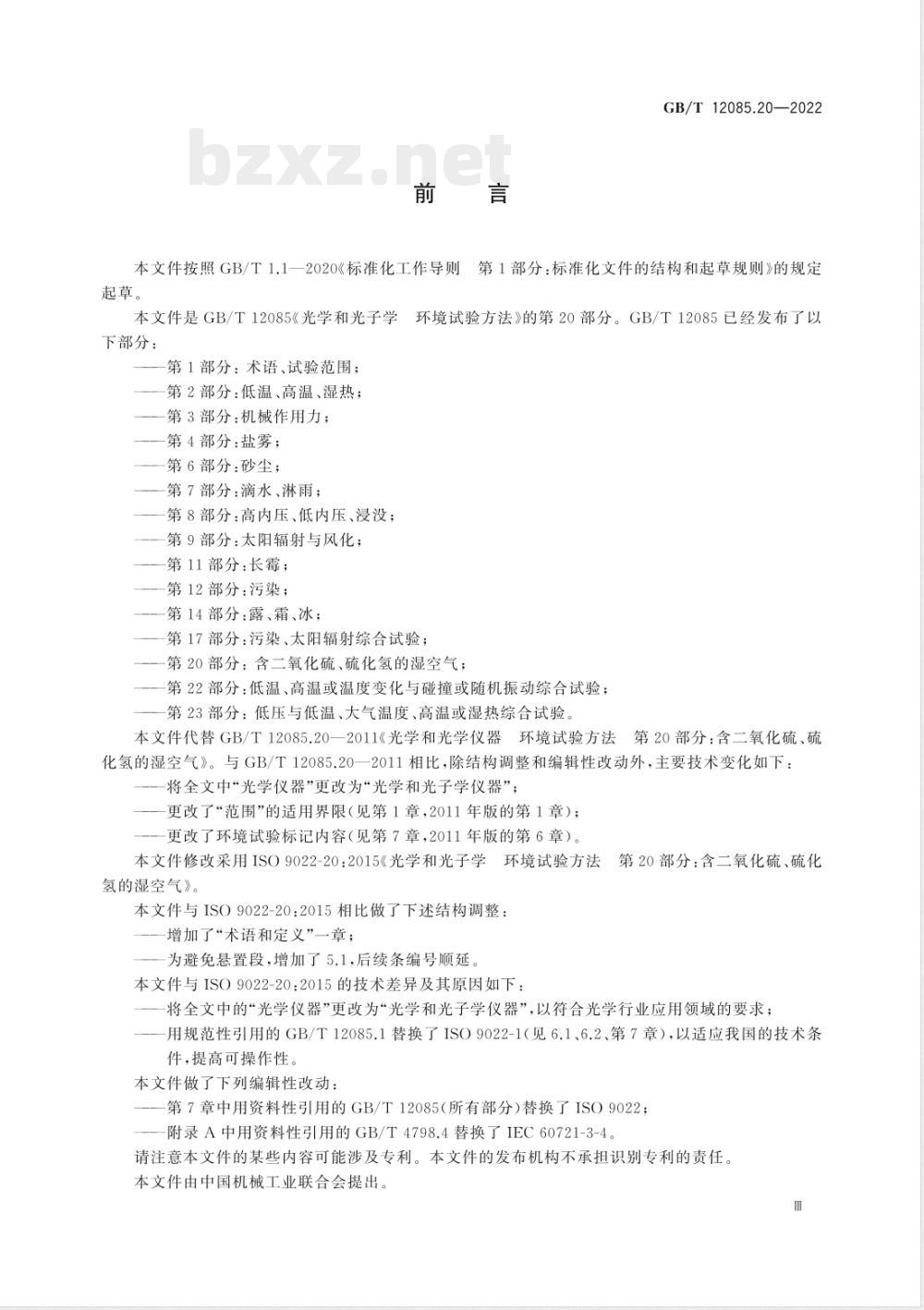 一第17部分:污染、太阳辐射综合试验;—一第20部分:含二氧化硫、硫化氢的湿空气;第22部分:低温、高温或温度变化与碰撞或随机振动综合试验;第23部分:低压与低温、大气温度、高温或湿热综合试验。本文件代替GB/T12085.20一2011《光学和光学仪器环境试验方法第20部分:含二氧化硫、硫化氢的湿空气》。与GB/T12085.20一2011相比,除结构调整和编辑性改动外,主要技术变化如下:将全文中“光学仪器”更改为“光学和光子学仪器”;一更改了“范围”的适用界限(见第1章,2011年版的第1章);更改了环境试验标记内容(见第7章,2011年版的第6章)。本文件修改采用ISO9022-20:2015《光学和光子学环境试验方法第20部分:含二氧化硫、硫化氢的湿空气》。